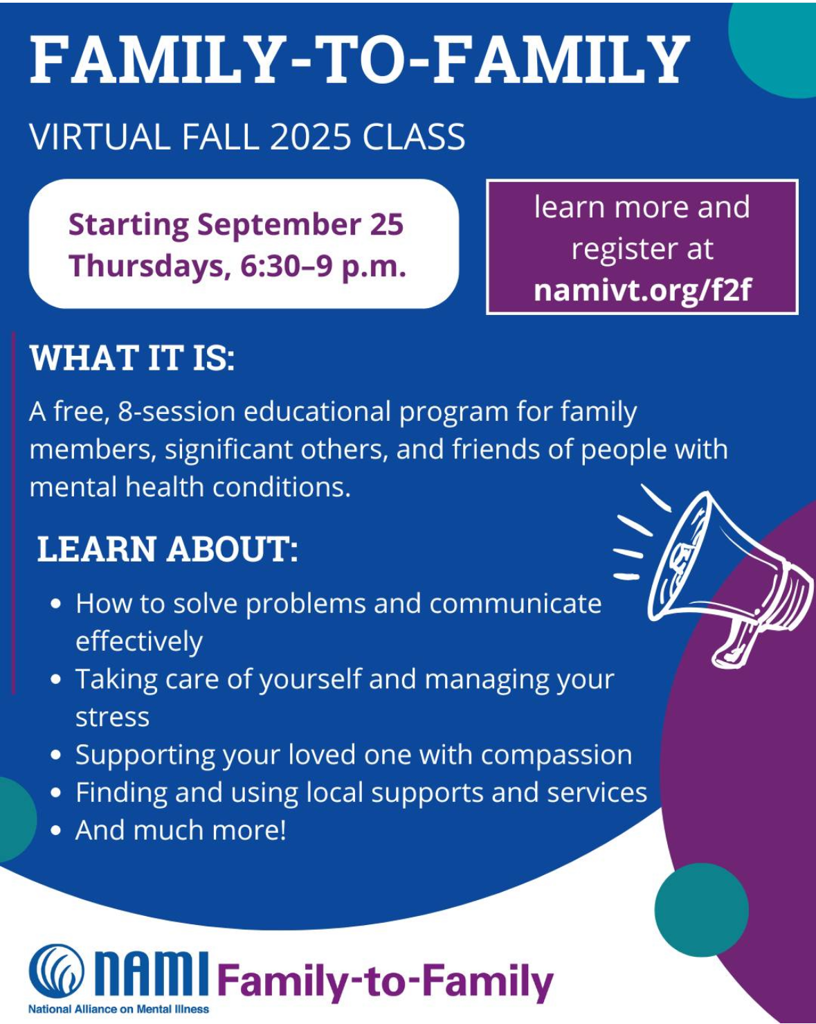January 3, 2026 @ 12:00 am - 4:00 am Family-To-Family Virtual Fall 2025 Class Family-To-Family Virtual Fall 2025 Class Via Zoom